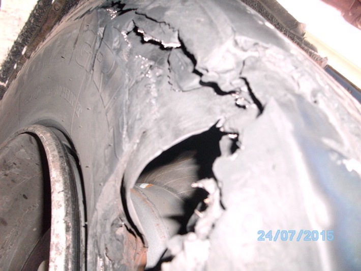 beschädigt, dass ein ca. 8cm x 18cm großes Loch erkennbar war (Foto). Der mitgeführte Sattelanhänger wies ebenfalls mehrere schwerwiegende technische Mängel auf:
