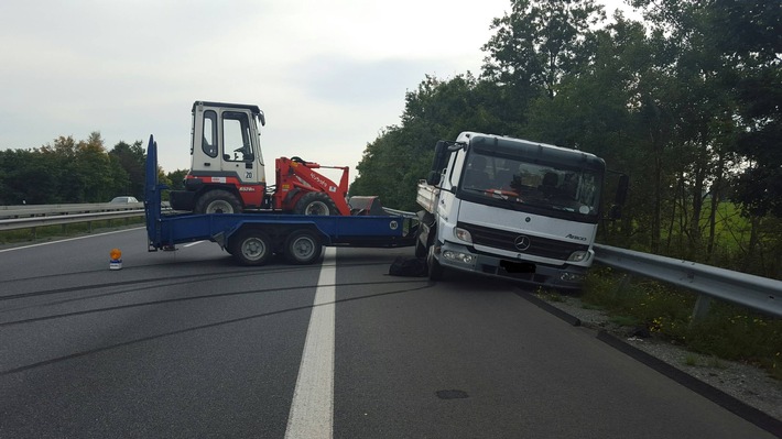 Der 56-jährige Lkw-Fahrer aus Essen befuhr mit seinem Gepann die Autobahn, als sich sein Anhänger, beladen mit einem Radlader, aufschaukelte. Der Fahrzeugführer konnte das Gespann nicht mehr unter Kontrolle bringen, so dass dies schließlich nach rechts in die Seitenschutzplanke stieß. Das Zugfahrzeug kam entgegengesetzt der Fahrbahn zum Stehenm, und der Anhänger verkeilte sich auf dem Hauptfahrstreifen. Der 56-Jährige blieb unverletzt. Aufgrund der aufwendigen Bergung musste die Fahrbahn in Richtung Bremen zunächst für ca. 1 Stunde halbseitig und danach für ca. 3,5 Stunden voll gesperrt werden. Hierdurch kam es zu massiven Verkehrsbehinderungen auf der A 27 und auf den Umleitungsstrecken. Der entstandende Gesamtschaden beträgt ca. 20.000 Euro.Während der halbseitigen Sperrung stellten die Beamten wiederholt fest, dass viele Verkehrsteilnehmer sehr langsam an der Unfallstelle vorbei fuhren, um zu gaffen und Aufnahmen von der Unfallstelle mit ihren Mobiltelefonen zu machen. Dadurch behinderten diese ebenfalls massiv den fließenden Verkehr. Die Beamten schritten konsequent ein und leiteten Bußgeldverfahren gegen mehrere Betroffene ein.