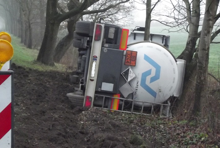 Der Sattelzug befuhr die Landesstraße 119 aus Richtung Ebersdorf kommend in Fahrtrichtung Lintig. Infolge einer Unachtsamkeit des 57-jährigen Fahrzeugführers aus Melle kam der Sattelzug nach rechts von der Fahrbahn ab und geriet in den dortigen Seitenraum, wo er zum Stehen kam. Bedingt durch den weichen unbefestigten Untergrund kippte der Sattelzug jedoch kurze Zeit später auf die rechte Fahrzeugseite. Der Sattelzug war mit flüssigem Aluminiumchlorid beladen. Bei dieser Chemikalie handelt es sich um einen ätzenden, sauren, anorganischen Stoff. Kleine Mengen des Gefahrgutes wurden durch ein Belüftungsrohr des Tankaufliegers frei gesetzt. Die Feuerwehr Geestland erschien mit dem Gefahrgutzug am Unfallort. Feuerwehrkräfte dichteten die Leckage ab und fingen den ausgetretenen Gefahrstoff auf. Nach kurzer Zeit konnte die Feuerwehr eine Gefährdung für die Umwelt ausschließen. Verletzt wurde niemand. Bedingt durch die anspruchsvollen und zeitaufwendigen Umladearbeiten, Bergungsarbeiten und Ausbesserungen an der Unfallstelle ist die Landesstraße 119 zwischen Ebersdorf und Lintig vermutlich bis zum heutigen Nachmittag gesperrt. Es entstand ein geschätzter Gesamtschaden in Höhe von über 100.000 Euro.