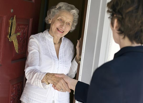 Ziehen Sie telefonisch eine Nachbarin oder einen Nachbarn hinzu, wenn unbekannte Besucher vor der Tür stehen, oder bestellen Sie die Besucher zu einem späteren Termin, wenn eine Vertrauensperson anwesend ist.